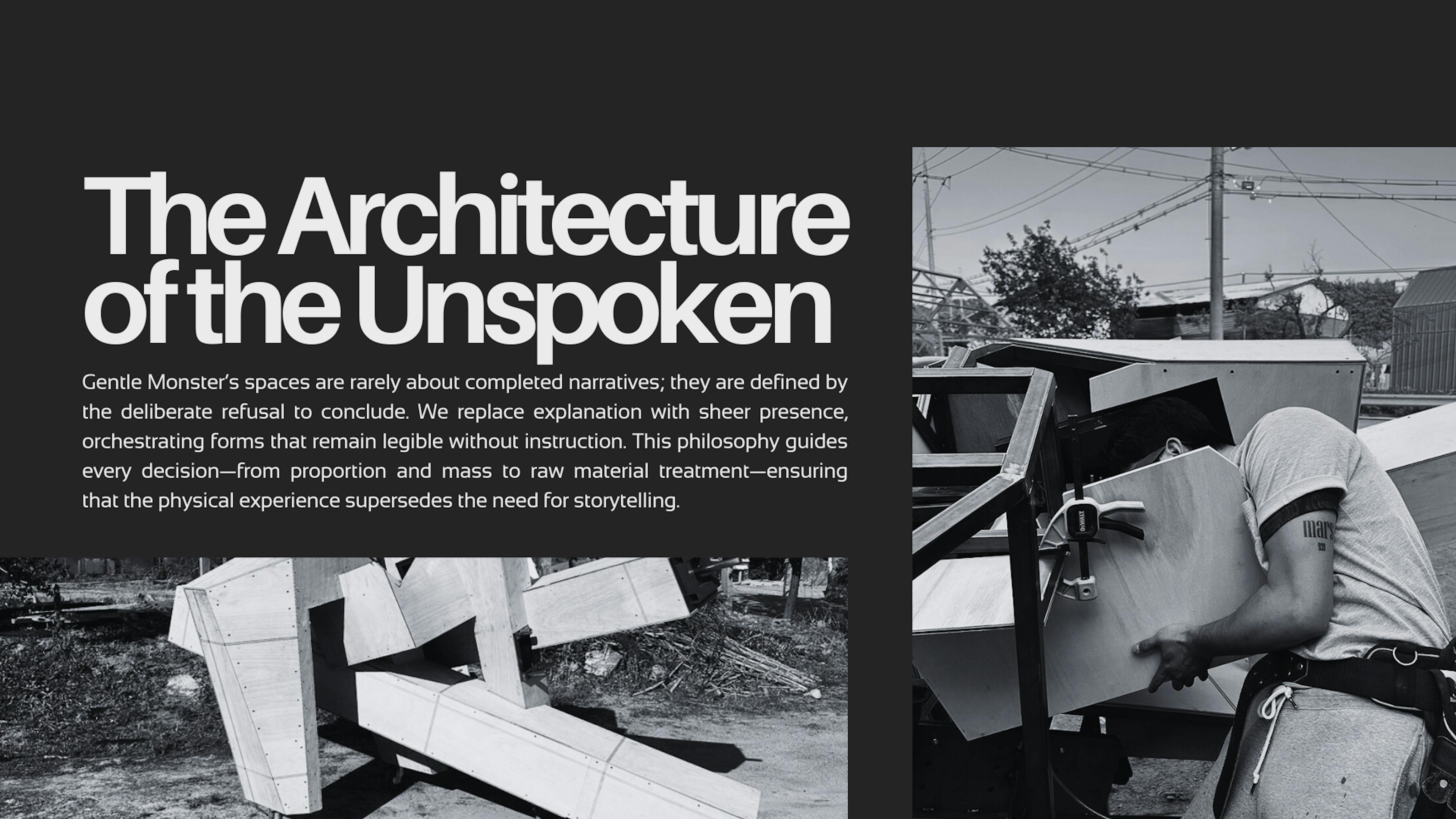 Gentle Monster elevates retail from a showroom to a sanctuary of artifacts. In response, we executed a calculated rejection of the illustrative—stripping away descriptive graphics, symbolic cues, and decorative finishes. Instead, we prioritized form as a stance and scale as a disruption. The result is an object that refuses to narrate the brand, operating instead on a silent, internal logic—designed to be read, never explained.